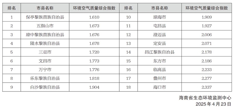 环境空气质量排名靠前的市县分别是保亭黎族苗族自治县、五指山市和琼中黎族苗族自治县,排名靠后的市县分别是海口市、儋州市和临高县。2025年3月全省18个市县环境空气质量排名如右: