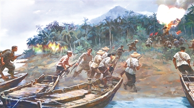 另一边,王文明率部按预定计划,从椰子寨对岸的定安县丹村出发,于惊涛骇浪中分乘8只木船强渡万泉河,在椰子寨上游的上园渡口登岸后,向敌据点摸索前进,顺利抵达约定位置。