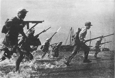 4月17日2时至6时,解放军渡海部队在海口以西至临高角一带强行登陆。敌军为阻止我军登陆,在海岸带设置了重重障碍。在抢占滩头时,有些地方来不及剪断铁丝网,有的解放军战士趴在上面,让战友踏着自己的身体跳过去;有的尚未下船,便牺牲在了船上;有的在涉水冲向岸边时,被敌人的子弹夺去了宝贵的生命。解放军指战员们前仆后继,与敌人展开了惨烈的抢滩登陆战。