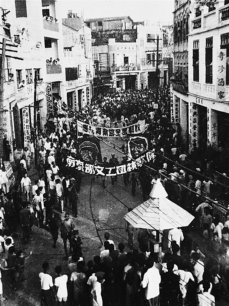史料记载,1950年4月16日19时30分,琼州海峡,夜黑风高,怒涛汹涌,中国人民解放军第40军、43军共约2.56万名指战员,分乘400多艘木帆船,从雷州半岛起航南下,于次日2时至6时,在海口以西至临高角一带强行登陆。渡海部队在海上遭遇了敌机的轰炸,军舰的阻击。人民解放军英勇作战,突破了国民党守军“伯陵防线”的海上封锁,创造了军事史上木船打败军舰的神话。