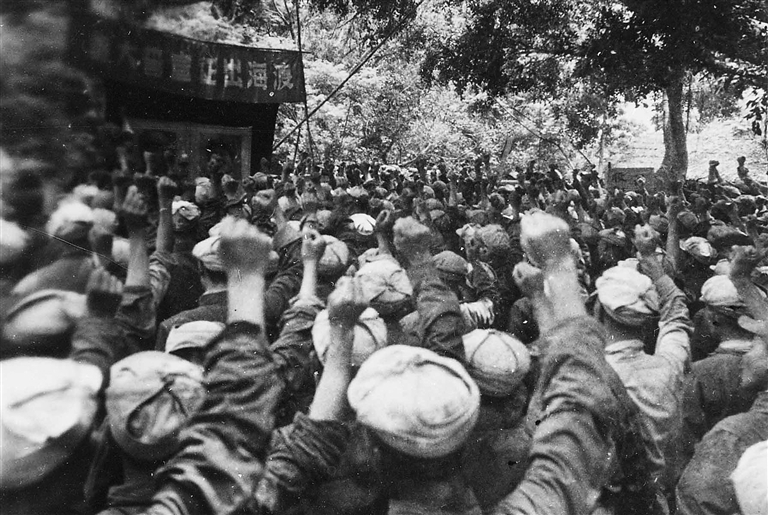 分批潜渡,加强内应。正如本栏老照片所示,渡海作战兵团行动起来了,准备潜渡登岛的先锋营全体指战员参加动员大会并集体宣誓,“打到海南岛,解放全中国!”1950年3月5日傍晚,渡海作战兵团第四十军一一八师三五二团一个加强营共799名战士作为首批潜渡部队正式起航,驾14艘帆船从雷州半岛灯楼角驶向海南儋县(今儋州市)白马井。