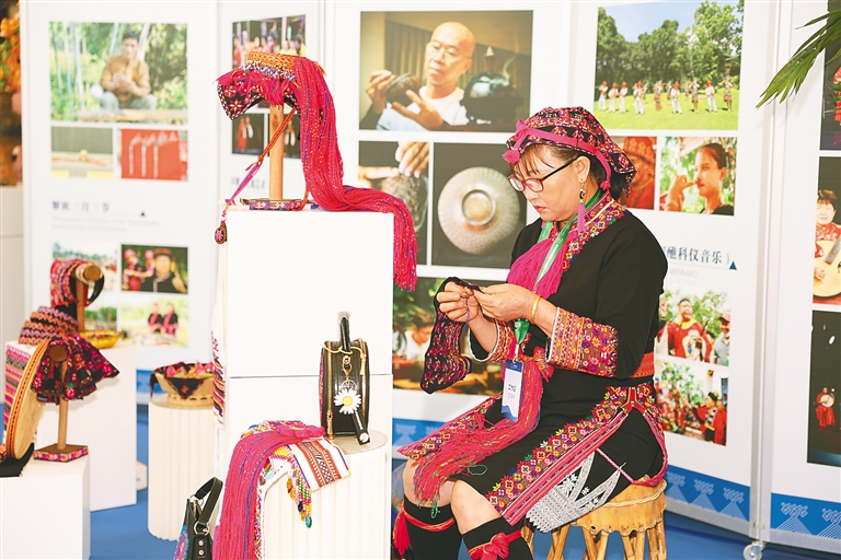 现场,海南非遗展示区现场展示的苗绣纺织技艺。海南日报全媒体记者 周达延 摄