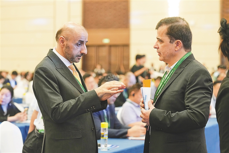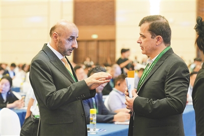 4月28日,中国—阿拉伯国家合作论坛第十一届企业家大会暨第九届投资研讨会上,两名与会人员在会议间隙交流。海南日报全媒体记者 封烁 摄