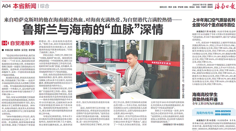 海南日报记者正是在那天首次采访了他,并于次日《海南日报》头版刊发以《鲁斯兰:我对海南一见钟情》为题的报道,讲述了鲁斯兰与海南的缘分、在海南读书期间长期坚持无偿献血的善举。