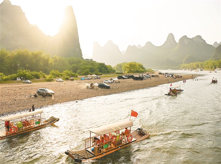 5月2日,在广西桂林阳朔,游客在漓江上乘竹筏游玩。 新华社发