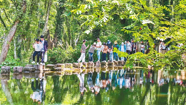 5月2日,游客在安徽省黄山市徽州区西溪南村游玩。