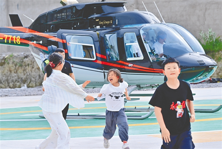 5月2日,在湖北省恩施州宣恩县贡水河畔,体验乘坐直升机的小女孩兴奋不已。新华社发