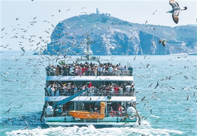 5月3日,游人在山东省荣成市海驴岛乘船进行环岛游。 新华社发