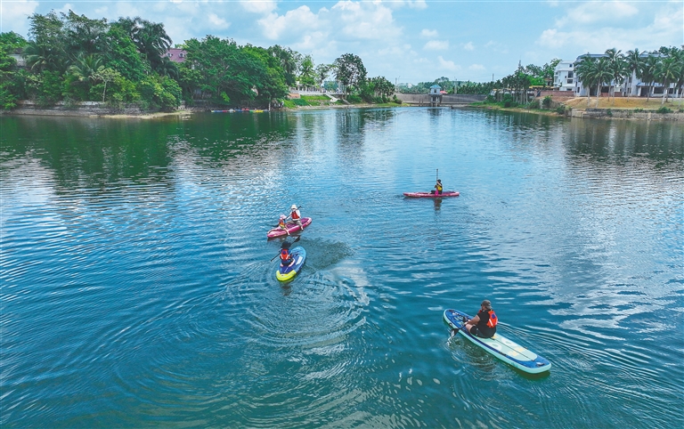 ①5月3日,定安南丽湖,游客坐上皮划艇,边划船边享受美好风光。