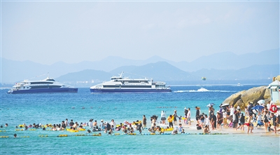 ①在三亚市蜈支洲岛旅游区,游客体验海上旅游项目。