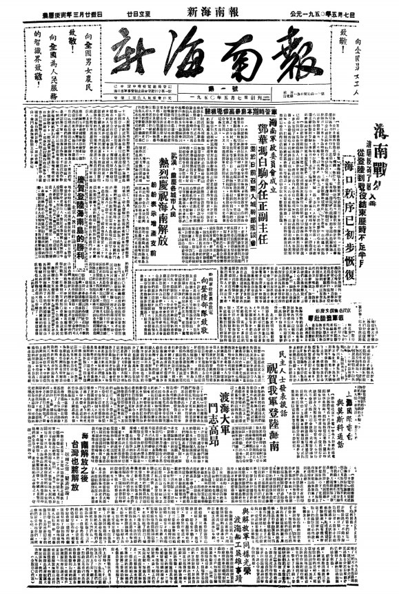 5000份连夜印刷的创刊号报纸,刚被报童拿上街就被抢购一空,市民们争相传阅。在这份创刊号上,硕大的标题“热烈庆祝海南解放”,传递着人们庆祝海南迎来新生的喜悦。