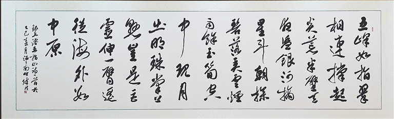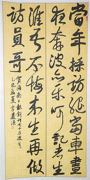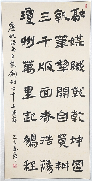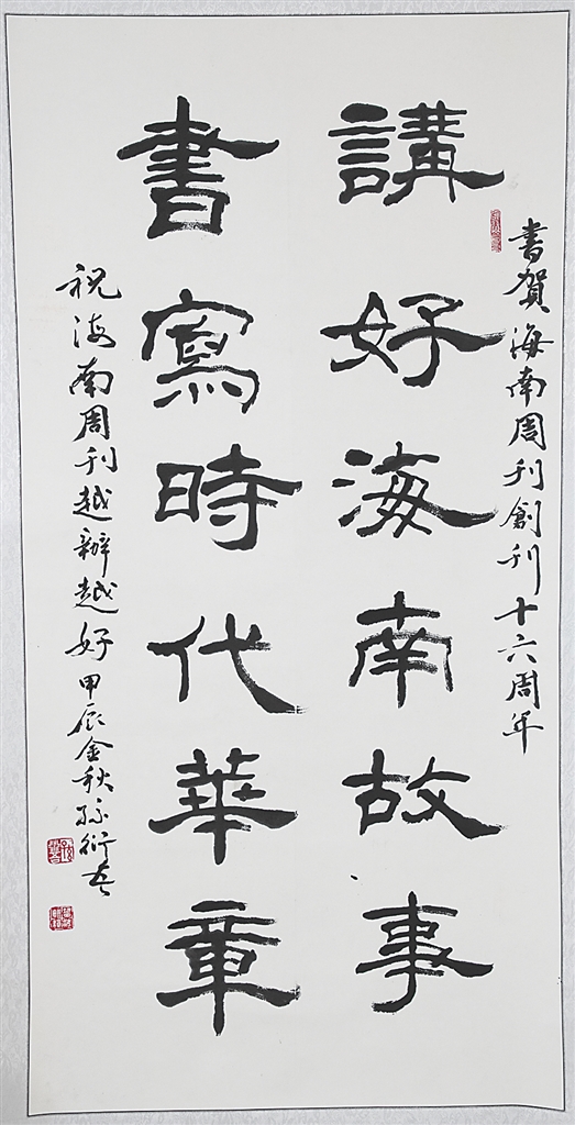 在《海南日报》创刊75周年之际,书法名家、读者、报社职工纷纷用书法作品表达自己的期许和祝福。海南省书法家协会主席陈洪、副主席李玉萍等书法家执笔而书,祝《海南日报》75岁生日快乐。陈洪创作4.5米长的巨幅行书作品相赠,这幅字既有古典气韵,又展现出强烈的视觉张力。他在创作这件作品时表示,《海南日报》作为海南省最具影响力的主流媒体,始终与时代同行,与海南共进,在传播中华优秀传统文化,弘扬和践行社会主义核心价值观等方面发挥了不可替代的作用,“期待《海南日报》继续做海南发展的‘见证者’、自贸港建设的‘推动者’、百姓心声的‘倾听者’,在新时代书写壮丽篇章!”