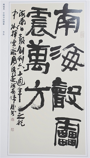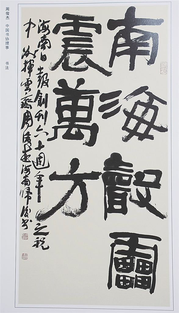 祖籍海南文昌的著名书法碑学理论家祝嘉,生前长期旅居苏州,但他心系故土。1985年《海南日报》创刊35周年,当时已经87岁的他精心题写“南天木铎”4字,取“木铎金声”之意蕴,表达对《海南日报》的肯定和期许。当代书坛名家吴东民为海南万宁人,曾于2010年《海南日报》创刊60周年之际,以行云流水、潇洒俊逸之笔书写王之涣诗一首,祝愿《海南日报》“更上一层楼”。曾给《海南日报》“庆生”的还有书法家陈振濂、何应辉,他们以灵动的笔触书写古诗以表祝贺。书法家周俊杰则以浑厚的线条写下“南海声雷震万方”,称赞《海南日报》不俗的影响力。