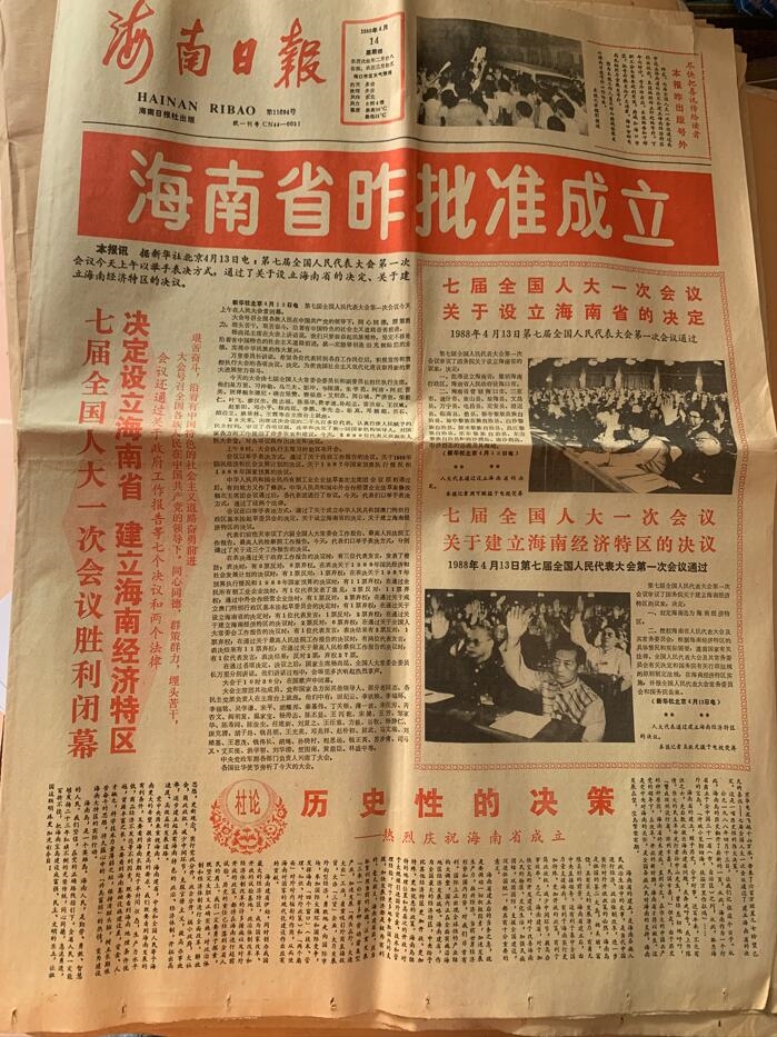 1967年6月,海南日报刊发《我国第一颗氢弹爆炸成功》新闻;1977年,海南日报发布恢复高考的消息;1988年4月,海南日报刊发《海南省昨批准成立》新闻……