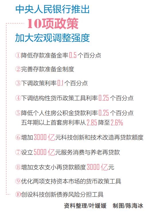 降低存款准备金率0.5个百分点、下调政策利率0.1个百分点、下调结构性货币政策工具利率0.25个百分点、降低个人住房公积金贷款利率0.25个百分点……中国人民银行行长潘功胜宣布了一揽子货币政策措施,加大宏观调控强度。