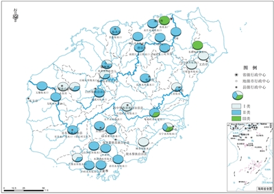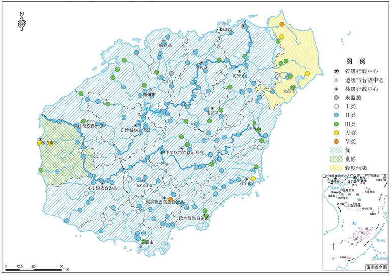 全省地表水水质总体为优,192个1省控监测断面(点位)的水质优良(Ⅰ~Ⅲ类)比例为96.4%,同比持平;无劣Ⅴ类断面,同比持平。19个市县中,文昌市水质轻度污染,东方市水质良好,其余市县水质为优。