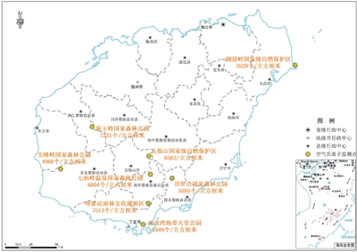全省主要森林旅游区空气负离子浓度处于较高水平,霸王岭空气负离子平均浓度为7231个/立方厘米、尖峰岭为4960个/立方厘米、五指山为6362个/立方厘米、七仙岭为6004个/立方厘米、铜鼓岭为3529个/立方厘米、吊罗山为5585个/立方厘米、呀诺达为7513个/立方厘米、亚龙湾为5489个/立方厘米,均优于世界卫生组织规定清新空气1000~1500个/立方厘米的标准,对人体健康极有利。