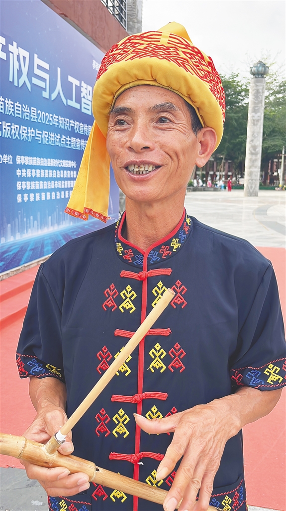 悠扬的乐声从保亭黎族苗族自治县七仙广场传来,如清泉流淌,似山风低吟。56岁的黎族竹木器乐传承人黄亚平指尖轻抚灼吧,竹管间跃动的音符与团队成员的和声交织,一曲《欢迎你到六弓来》唱出了黎乡的淳朴与热情。近日,黄亚平捧着一张特殊的“身份证”——作品登记证书,笑容里满是自豪:“这首歌的词曲、乐器,甚至乐器的制作,都是我的心血。如今有了版权保护,它们再也不会消失在时光里了。”