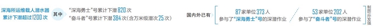 截至目前,通过潜航员的努力工作,“深海勇士”号累计下潜820次,“奋斗者”号累计下潜384次(含万米级潜次25次),推动中国载人深潜运维能力达到世界先进水平。其中,“深海勇士”号创造了2天5潜,3天6潜,8天12潜等下潜纪录,“奋斗者”号创造了人类历史上首次连续8次下潜到万米的纪录。国内外已有87家单位373人参与了“深海勇士”号的深潜作业、53家单位202人参与了“奋斗者”号的深潜作业。在科学和探索上,“深海勇士”号在中国南海1500米水深发现二处明代沉船遗址“南海西北陆坡一、二号沉船”。“奋斗者”号获得人类历史上首个万米岩石样品,发现全球最深的深渊狮子鱼新纪录、发现世界已知最深的自然鲸落生态系统。