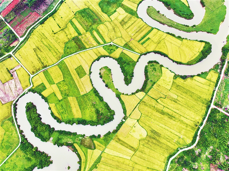 近日,海口市琼山区云龙镇三十六曲溪湿地公园连片稻田已进入成熟期,弯曲的溪流、金黄色的田野勾勒出琼北地区特有的田园美景。据了解,三十六曲溪湿地公园的水稻,每年11月插秧,次年5月前后收割。