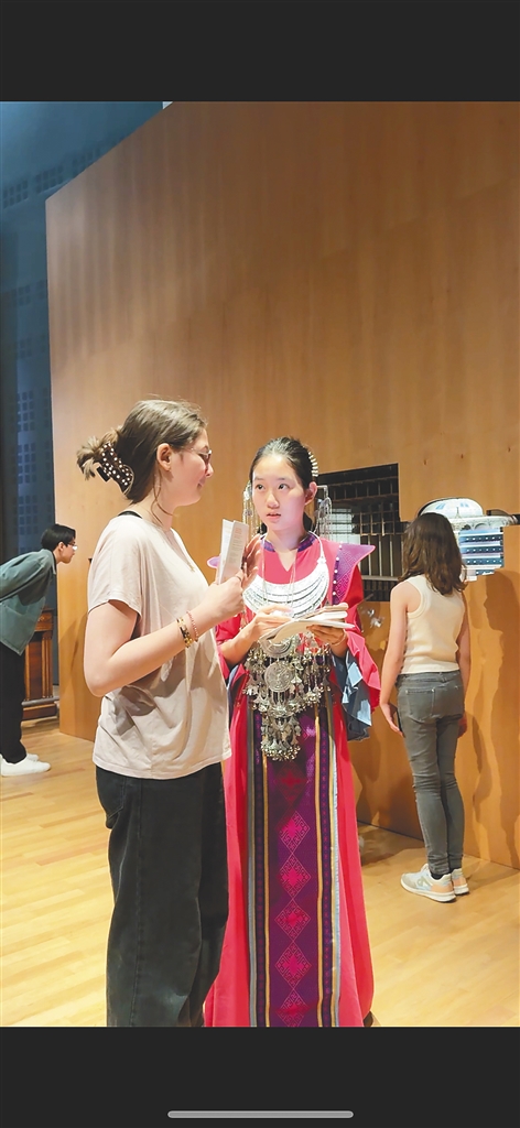 当天上午,合唱团前往被誉为“世界艺术殿堂”的巴黎歌剧院。身着传统黎锦苗绣服饰的孩子们,在恢宏的巴洛克建筑风格的穹顶下,现场快闪演绎了黎族歌曲《小小歌》和苗族歌曲《抓螃蟹》。空灵的嗓音与极具民族特色的和声编排,让路过的法国民众驻足停留,沉浸于中国少数民族文化的魅力中。