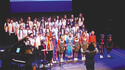 ①五指山黎苗童声合唱团与法国巴黎宝丽声童声合唱团在巴黎同台演唱。张航 摄