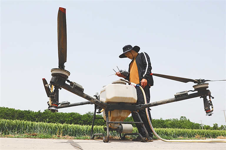 ① 5月7日,在河南省焦作市温县祥云镇古贤村,村民为植保无人机添加药液开展“一喷三防”。