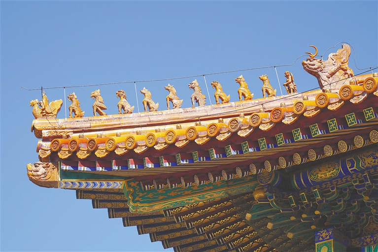 纵览故宫建筑,除太和殿外,其他建筑上的脊兽数量依次递减:保和殿、皇极殿九兽,太和门、中和殿七兽,东西六宫五兽,亭台阁院三或一兽。