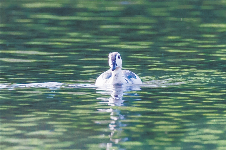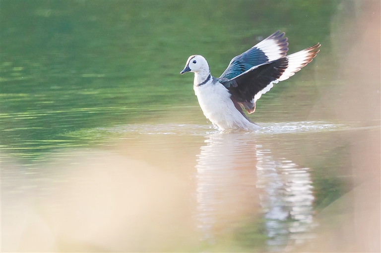 据介绍,棉凫是鸭科中体形最小的水鸭,被称为“世界上最小的鸭子”。棉凫体长31~38厘米,体重不足300克,羽毛主要呈白色,头圆,脚短,喙如鹅喙,短而底部较深,远远看上去像一团棉球,故得名“棉凫”。雄性棉凫繁殖时,毛色泛黑绿色光泽,头部、颈部及下身主要呈白色。飞行时,雄鸟双翼呈绿色并有白带,雌鸟羽色较淡。