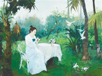 新加坡画家杨李居的《新加坡河口》用水彩的透明质感捕捉城市光影,将现代建筑与自然景观和谐交融;彭业蓉的《史密斯街》以写实技法勾勒南洋建筑的历史纹理,展现新加坡多元文化融合的城市特质,以细腻笔触描绘狮城风貌。海南画家王家儒的《春信》、符祥康的《晨》等通过用色彩描绘光影定格了美好生活的瞬间,林国华的《疍家码头》以印象派的表现手法,在记录自然景观的同时巧妙融合了海南疍家文化与新加坡南洋元素。