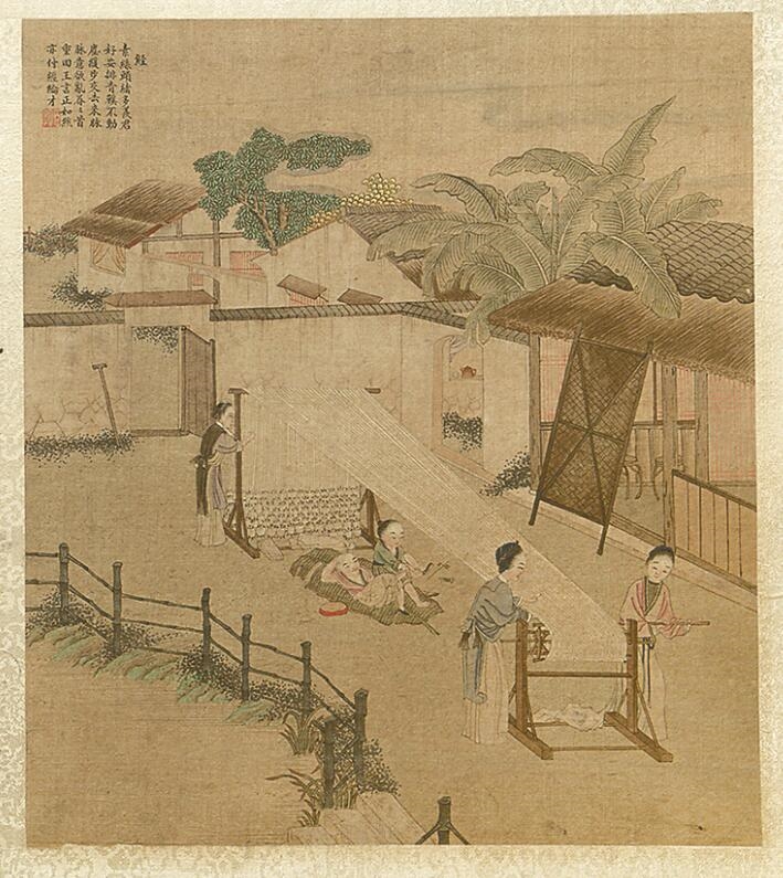此后就是一系列纺织环节:纬、织、络丝、经、染色、攀花、翦帛、成衣,这是将丝线加工染色成布匹,然后织布成衣的后续过程。历经这般辛劳,许多古代蚕妇织女也未必能穿上自己辛苦制成的衣服,所以才有了诗人“遍身罗绮者,不是养蚕人”的感叹。
