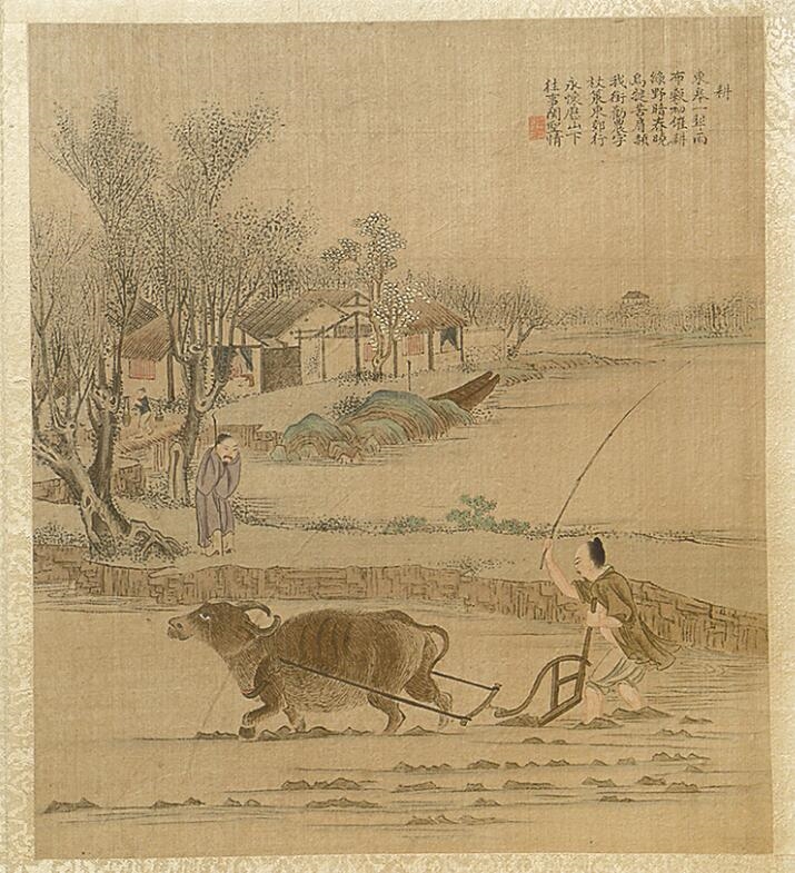 焦秉贞所绘《耕织图》为清代风俗,画风细腻纤丽,在技法上参用西洋焦点透视法。其中,耕图内容包括浸种、耕、耙耨、耖、碌碡、布秧等。