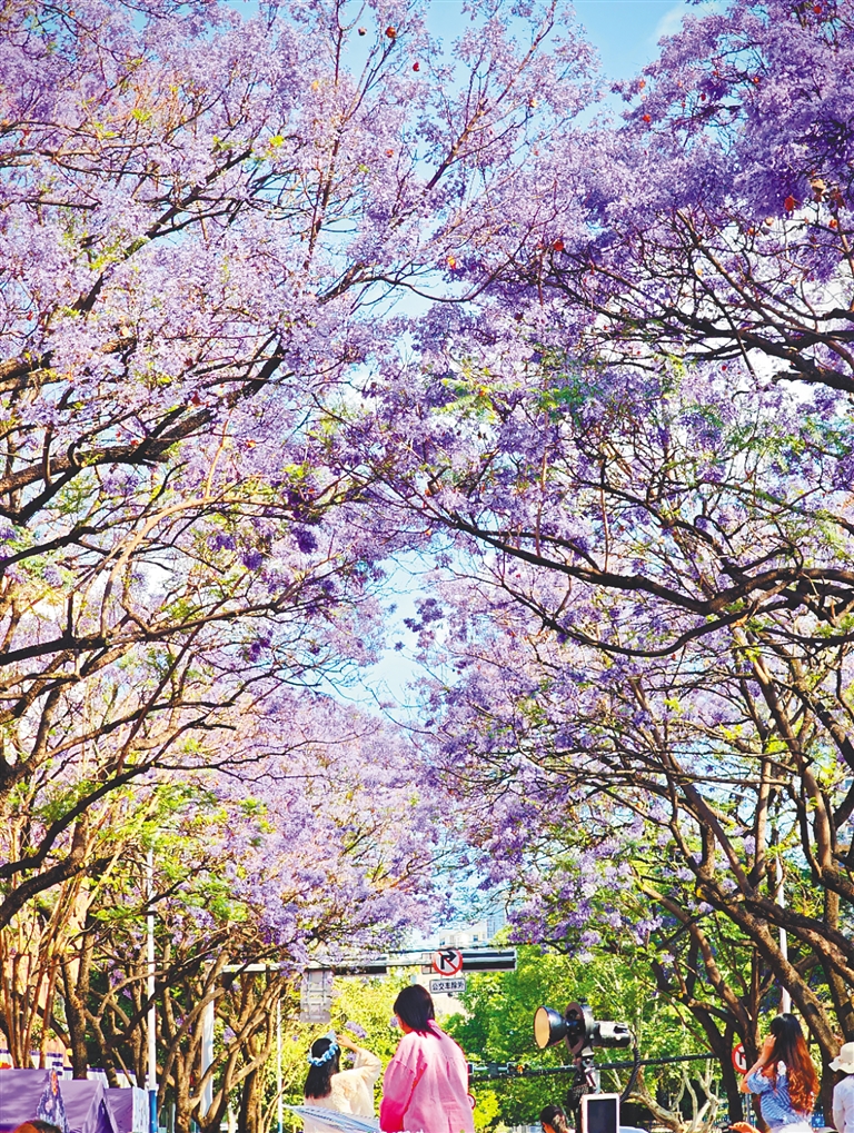 从2005年起,当地政府在教场中路打造蓝花楹景观。20年后的今天,551株蓝花楹舒展枝丫,树冠交织成延绵1.4公里的花穹。