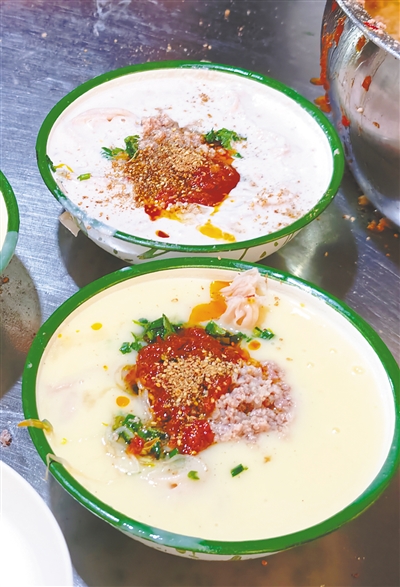 创造复杂的味觉体验是云南人的特长。热烫的稀豆粉盖在米线上,淋上辣油、麻油,撒上肉末、芝麻碎、花生碎、香菜和葱花,入口细腻柔滑,醇厚的豆香交织麻香、辣椒和坚果香,口感复杂多元却又十分和谐。