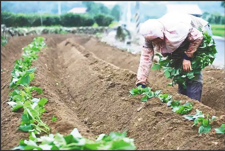 趁着停雨的间隙,母亲挑着簸箕,我背着背篓,满载着红薯秧苗,领着弟弟妹妹走向希望的土地。我们穿着凉鞋走过水田和菜园的小路,扰动了路边的杂草,草上水珠碎落到脚上,凉意仿佛透过皮肤沁入骨髓。我们脱下鞋子,赤脚下了菜地,不消说那湿土也是凉凉的。清凉侵袭着我们,夏日的燥热消退了几分,在这样的环境下劳作,我们并不觉得辛苦难熬。插红薯秧很简单,把秧苗缓缓插入松软的沃土里,只要确保至少一个节没入土中就好;当然两个节更佳,能增加生根成活的概率。