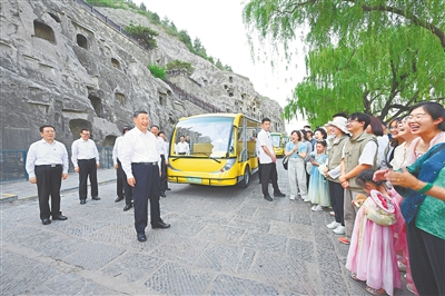 已有1500多年历史的龙门石窟,是重要的世界文化遗产。习近平来到这里,察看石窟整体布局风貌和代表性窟龛、造像,同现场的文物保护工作者亲切交流。他强调,要把这些中华文化瑰宝保护好、传承好、传播好。游客们见到总书记,都十分欣喜,纷纷向总书记问好。习近平不时同大家交流,特别鼓励小朋友们多到实地寻溯中华文化,从小树立文化自信。他指出,文旅融合前景广阔,要推动文旅产业高质量发展,真正打造成为支柱产业、民生产业、幸福产业。