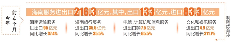 据统计,今年前4个月,海南服务出口133亿元,同比增长51.5%;进口83.3亿元。运输服务、旅行服务、文化和娱乐服务、金融服务、保险服务及电信、计算机和信息服务等板块进出口额均实现增长。全省服务贸易伙伴共122个,贸易额排前5名的国家(地区)为中国香港、新加坡、俄罗斯、爱尔兰和美国。