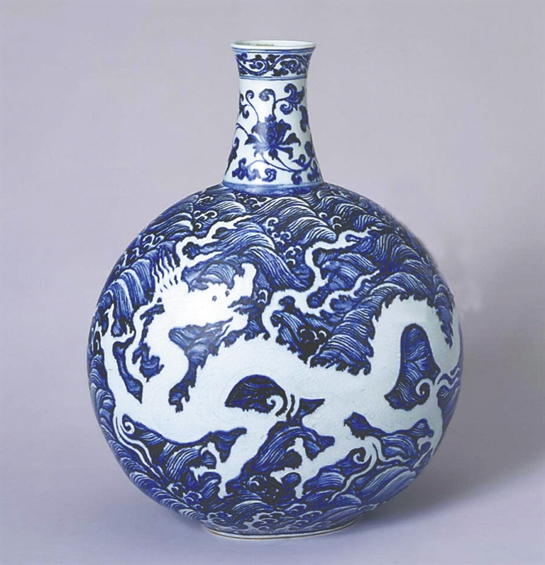 宣德青花的钴料在窑火中晕染出深浅相宜的蓝,如同小满时节天色将暮未暮的苍穹,器身翻涌的浪涛纹,既似江南五月丰沛的雨水,又暗合《周易》中“云行雨施,品物流形”的天道。当五月的熏风掠过故宫的琉璃瓦,扁壶上的白龙仿佛在青花波涛中游动起来,六百年前的工匠以瓷土为纸、钴料为墨,将二十四节气的轮回与王朝的气象熔铸一体。