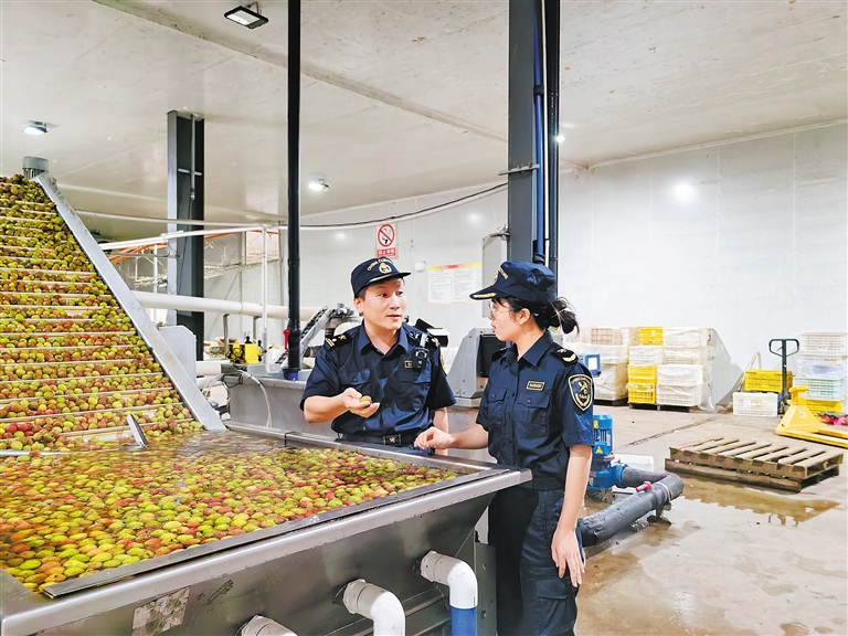 5月23日,海口海关隶属三亚海关关员在水果包装厂查检即将出口的荔枝。近年来,海南积极开拓海外市场,荔枝远销阿联酋、加拿大、法国、英国等国家。据海口海关统计,今年以来截至5月22日,海口海关共监管出口荔枝200批,货值超5000万元。通讯员 吴天雁 摄(相关报道见A03版)