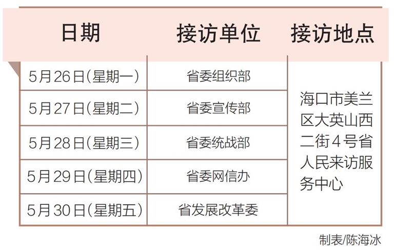 5月26日至30日,省委组织部、省委宣传部、省委统战部、省委网信办、省发展改革委相关负责人将在海口市美兰区大英山西二街4号省人民来访服务中心接访群众。