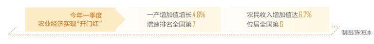 本报讯(海南日报全媒体记者孙慧)海南日报全媒体记者从5月23日召开的全省农业重点工作部署推进会上获悉,今年一季度,我省积极抓好农业生产,农业经济呈现回升向好态势,一产增加值增长4.8%,增速排名全国第7;农民收入增加值达6.7%,位居全国第6,保持了快于全国、快于城镇的好势头,农业经济实现“开门红”,不少亮点工作可圈可点。