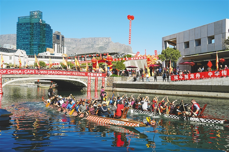 图为5月24日人们在南非开普敦参加龙舟比赛。新华社发