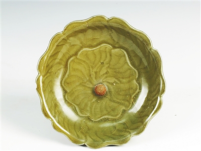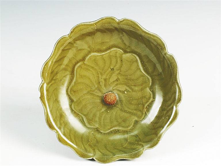 了枝繁叶茂、挂有硕果的荔枝纹;葵口盘内底露胎,贴塑泛红荔枝造型,这种泛红的颜色可能并不是有意为之,而是素胎烧造后自带的火石红色。青绿之中,这一抹丹红确实亮眼。