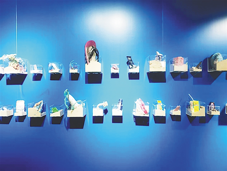 展馆左边,是一面蓝色的展板,展板上齐刷刷镶嵌着两排透明的水晶盒,每个盒子里面被不同的内容填充,射灯照射下,光影交错,特别抓人眼球,非常具有欣赏性,走近一看才知道,原来每个盒子里是细白的海沙和海洋垃圾,令人震惊。我们常常在海边沙滩上看到类似的海洋垃圾,没想到,艺术家会把海洋垃圾变成了艺术品。值得一提的是,不走近看,这些由海洋垃圾变身的艺术品还极具美感。不得不说,艺术家的脑洞就是和普通人不一样。