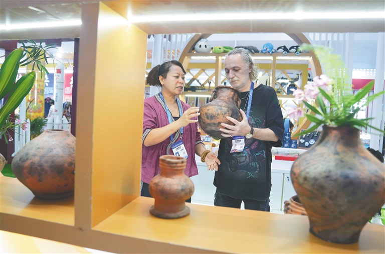 一旁,海南红泥陶瓷文化有限责任公司董事长卢云倩笑着说:“海南的红泥富含金属矿物质,才能形成这样独一无二的纹路。”文博会期间,卢云倩听到许多这样的赞叹。她透露,有多家外省企业向她抛出合作橄榄枝,不少同行前来交流取经,公司也希望通过与各地同行交流,碰撞出更多陶瓷创新的火花。