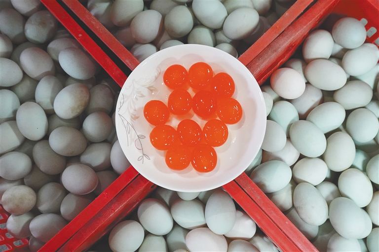 美味还来源于不打折扣的标准化工序——用于制作粽子的鸭蛋需要裹上混合盐水的红泥浆腌制30天,渗透的盐分让鸭蛋内的蛋白质凝固,脂肪得以释放并聚集,形成金灿灿的油脂,为粽子增添风味。“我们对红泥进行高温灭菌,并用机器将其搅拌细腻,这样腌制出来的鸭蛋味道均匀,更加美味。”许强说,“我们的鸭蛋不仅供给儋州粽子企业,还卖到万宁等地,供不应求。”
