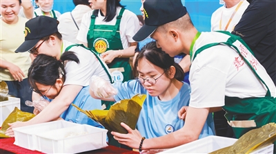 与之形成对比的是台下研学区。“阿姨,绳子怎么绑才不会松?”“叔叔,我的粽叶怎么破了?”……在这场别开生面的“粽子研学”上,从未包过粽子的儋州市思源高级中学学生现场“拜师学艺”,经验丰富的参赛选手化身“老师”,手把手传授包粽子技艺。
