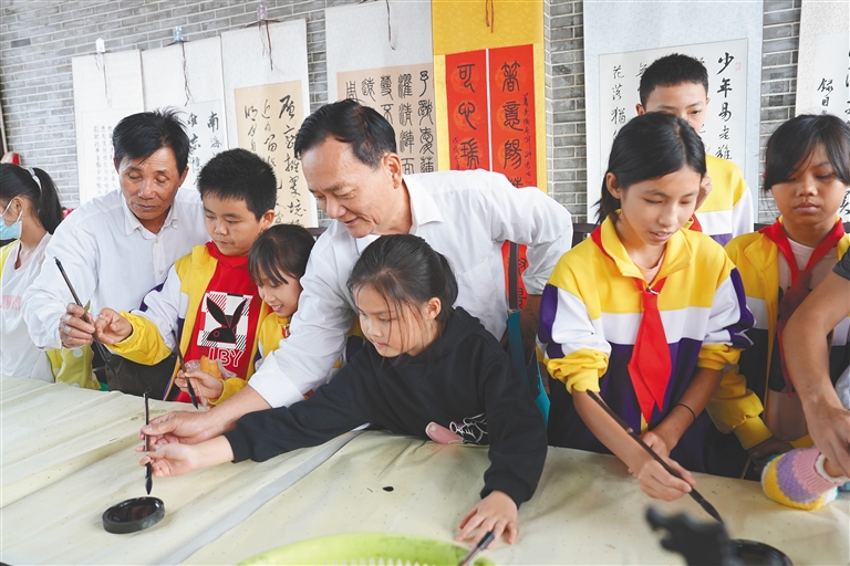 ②在万宁市后安镇曲冲村,万宁书法协会成员教孩子们写毛笔字。后安镇政府供图