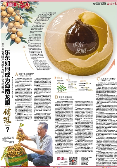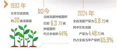 自1993年乐东引进首批30亩龙眼苗起,三十余载时光流转,如今当地龙眼种植面积已超6.3万亩,种植面积约占全省的44%。2024年,全省龙眼产量为6.8万吨,其中,乐东龙眼产量为4.48万吨,约占全省当年产量的65.9%,成为海南市县“产销冠军”。