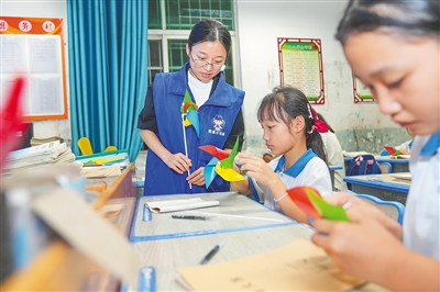 近日,屯昌县新兴镇新北村新北小学开设的“星光课堂”上,小学生在志愿者辅导下学习制作风车,并将“六一”国际儿童节愿望写在风车上。